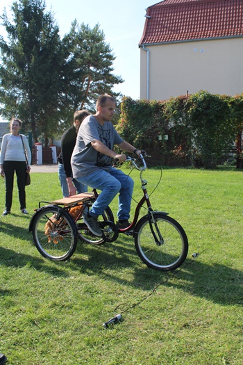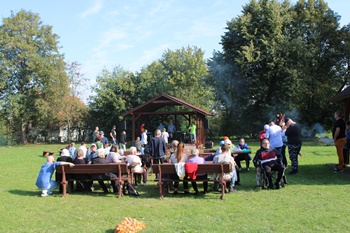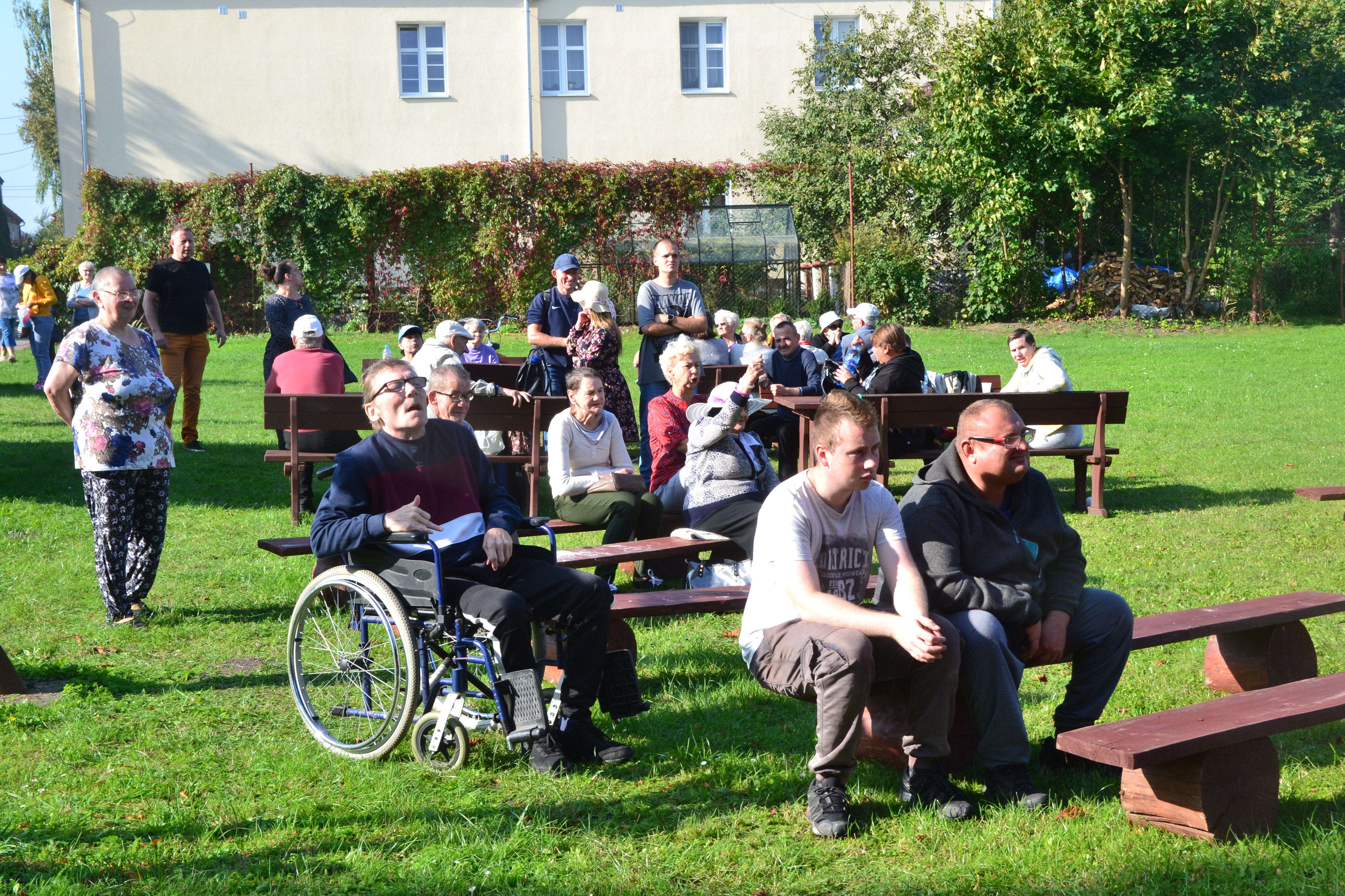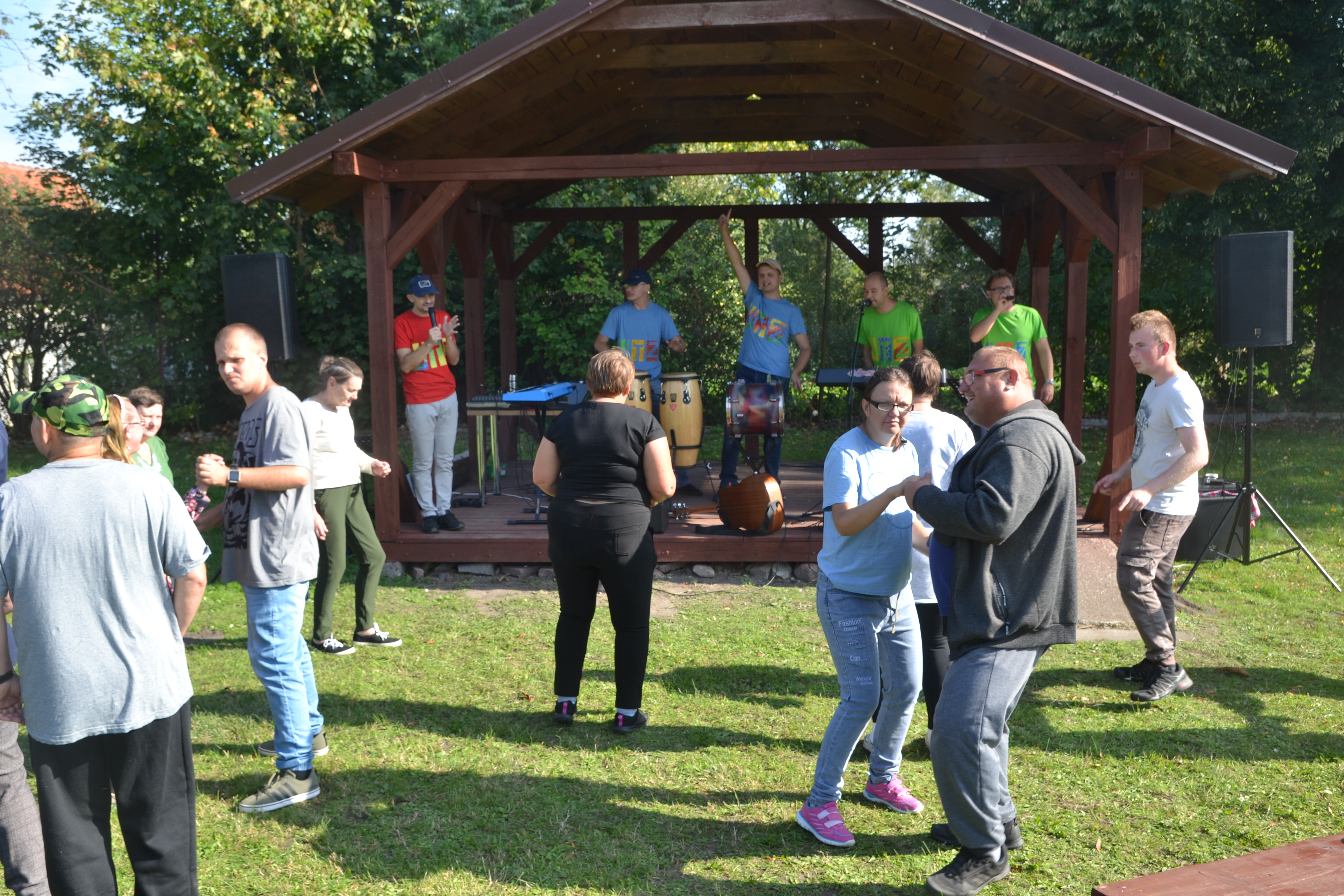 Spotkanie rozpoczęliśmy od uczty muzycznej- na naszej scenie wystąpił zaproszony przez nas Zespół Szwagry z Warsztatów Terapii Zajęciowej przy ulicy Beniowskiego w Elblągu. W spotkaniu brali udział również uczestnicy i pracownicy Środowiskowego Domu Samopomocy w Jegłowniku. Muzyka szybko porwała wszystkich zebranych do wspólnego tańca. Zawsze przy takich okazjach budzi się w nas duch sportowej rywalizacji, dlatego nie mogło zabraknąć konkurencji sportowych- wyścigu rydwanów, biegu z wiadrami i rzutu ziemniakiem do celu. Nie obyło się także bez zabawy dla pracowników, którzy mieli za zadanie pokonanie toru przeszkód, rzut ziemniakiem do celu oraz skok na skakance, a utrudnienie polegało na tym, że wszystkie te czynności trzeba było wykonać w parze z nogami związanymi wspólną tasiemką. Jak zawsze przy takiej okazji nasi podopieczni z zaangażowaniem nas dopingowali. Konkursy dostarczyły wszystkim wielu radości i rozbudziły ducha rywalizacji. Dodatkową atrakcją była także loteria fantowa.