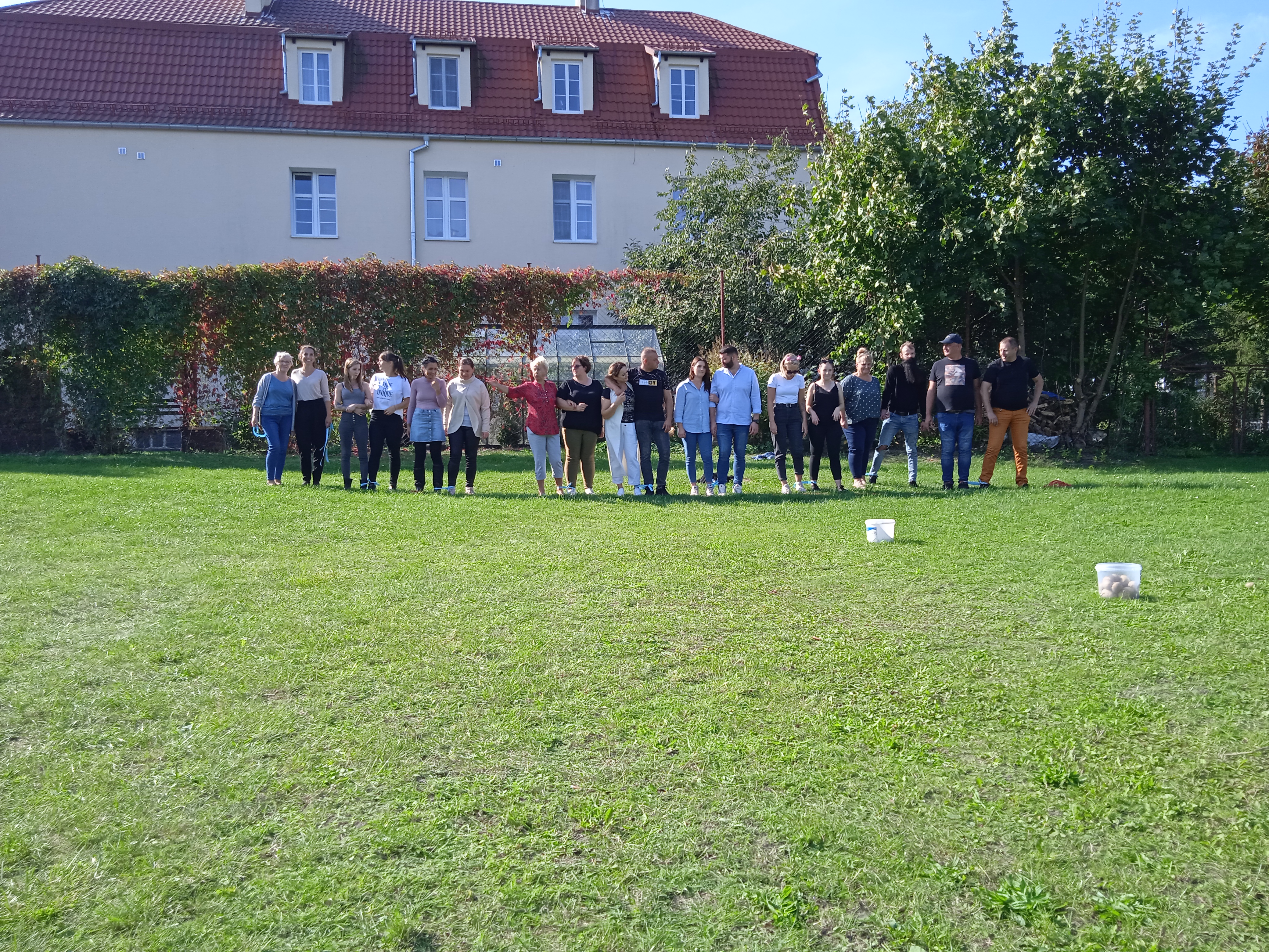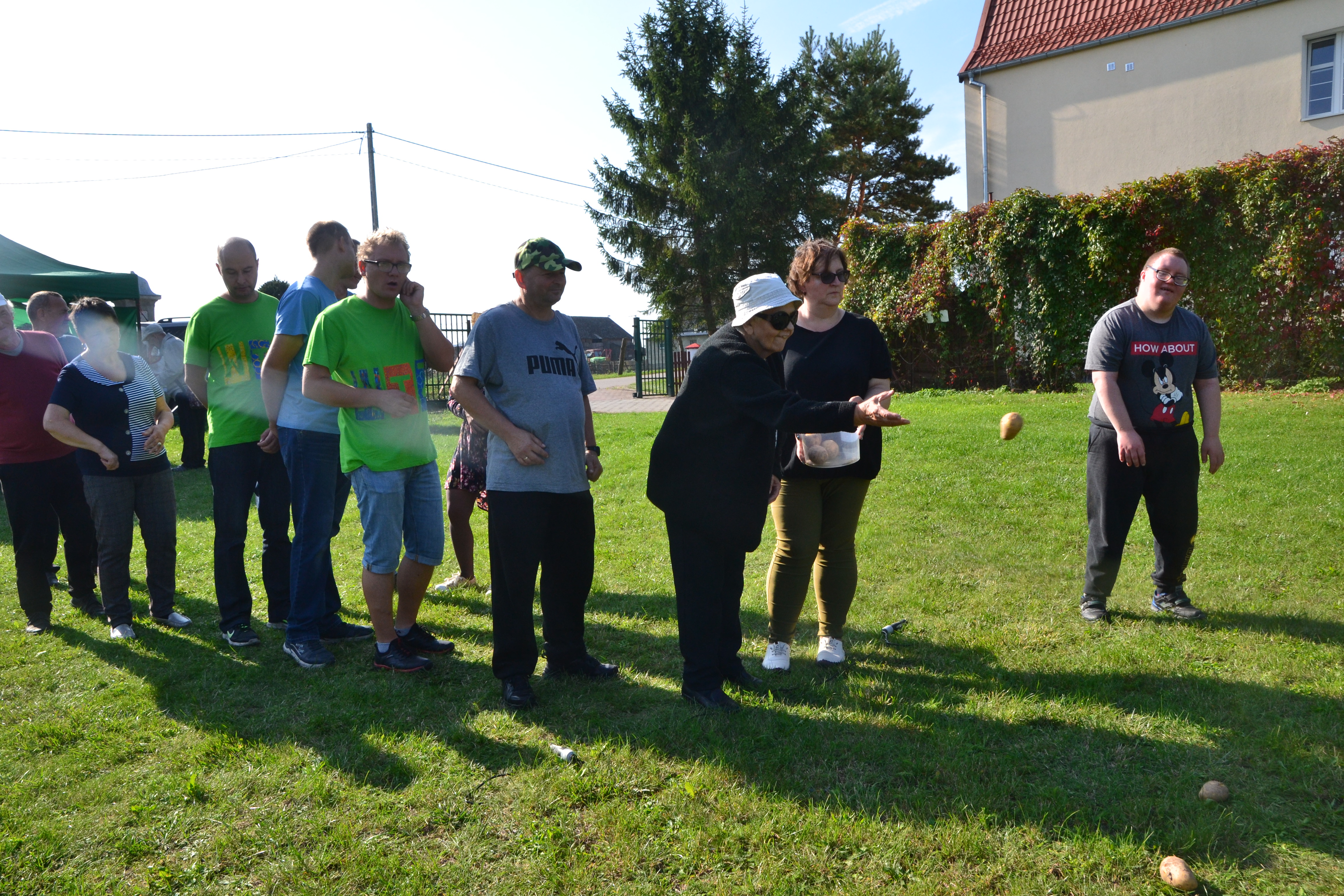 Dnia 27.09.2023 uczestnicy Środowiskowego Domu Samopomocy w Jegłowniku wraz z kadrą uczestniczyli w obchodach Dnia Pieczonego Ziemniaka zorganizowanego przez Środowiskowy Dom Samopomocy w Kwietniewie. Spotkanie otworzyła Kierownik ŚDS Pani Jadwiga Kubacka. Następnie mogliśmy posłuchać Zespołu „Szwagry” z Warsztatów Terapii Zajęciowej przy ulicy Beniowskiego w Elblągu – oczywiście nie obyło się bez wyśmienitych tańców przy skocznej muzyce. Tradycyjnie, odbyła się loteria fantowa oraz różne konkurencje sportowe w których nasi podopieczni chętnie brali udział. Także pracownicy mieli okazję zaangażować się w jedną z nich – należało związać nogi dwóch osób a następnie wspólnie pokonać tor przeszkód : slalom, rzut ziemniakiem do celu, skok na skakance oraz chód tyłem.