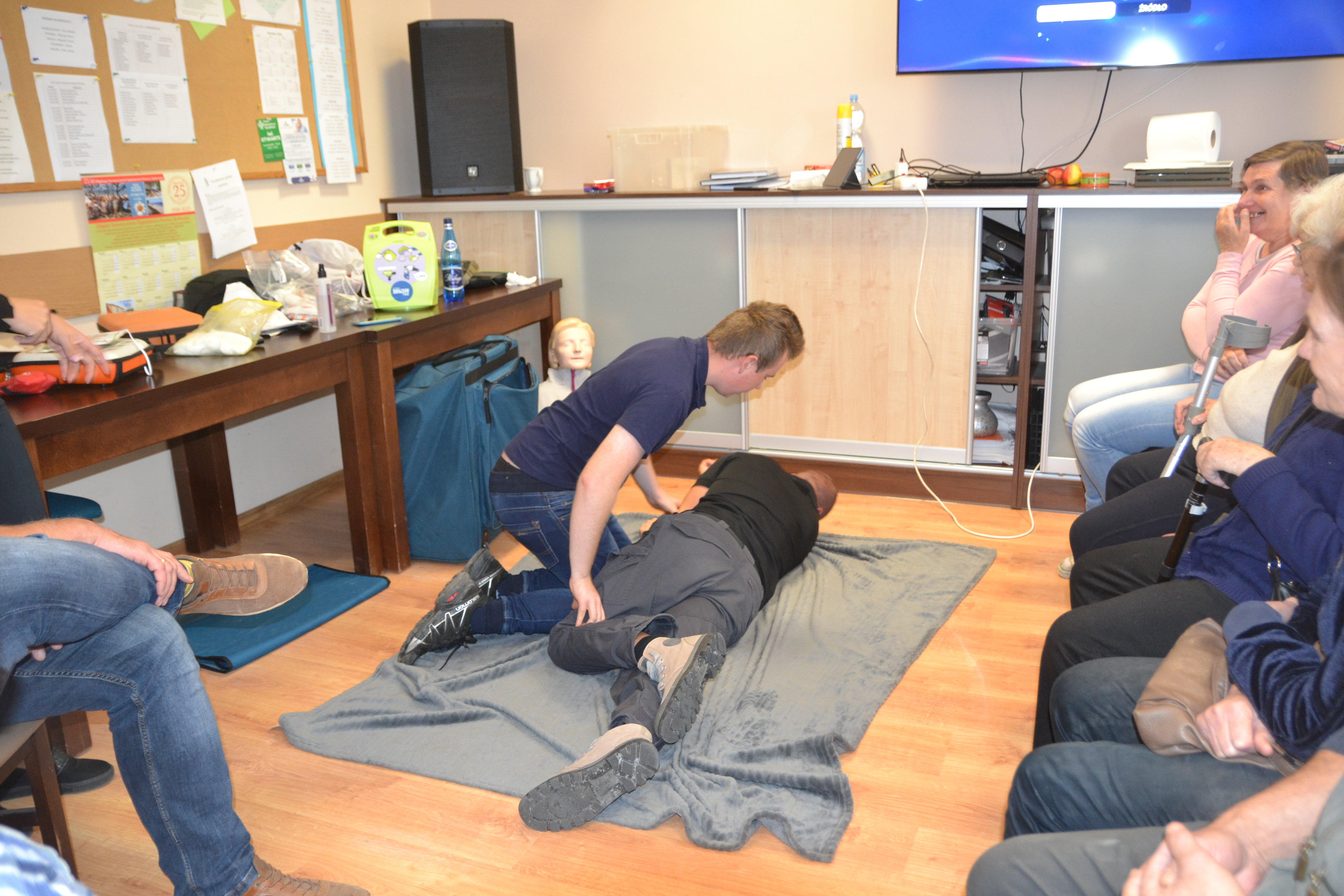 Podczas szkolenia poruszono następującą tematykę: resustytacja krążeniowo- oddechowa z użyciem defibrylatora, zadławienia, pozycja baczna bezpieczna, krwotoki, oparzenia oraz stany nagłe pochodzenia wewnętrznego. Wszyscy zebrani mieli możliwość obejrzenia filmów edukacyjnych, a po części teoretycznej mieliśmy czas na zadawanie nurtujących nas pytan w tej dziedzinie. Nie zabrakło także ważnych ćwiczeń praktycznych.