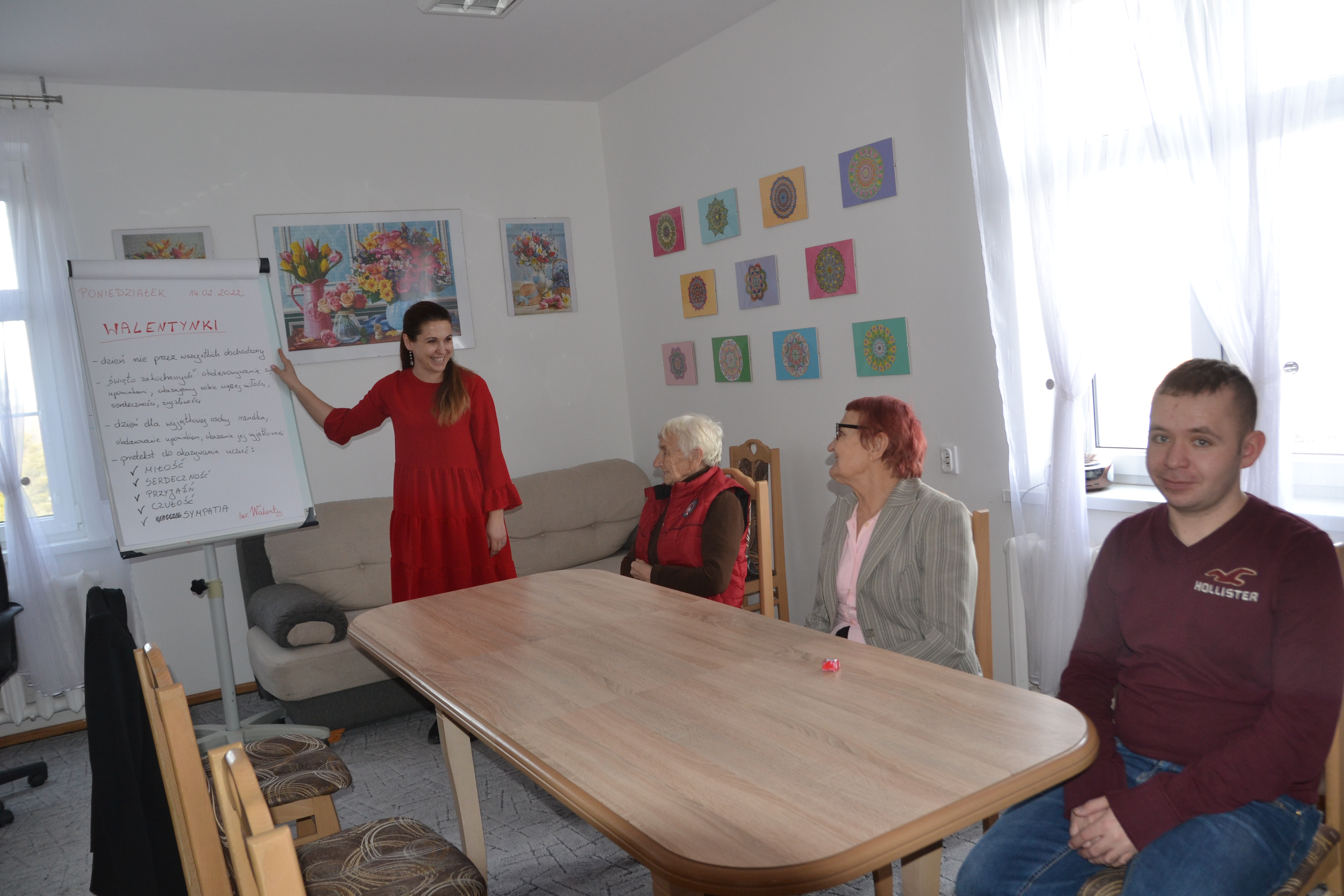 W związku z faktem, iż co roku 14 lutego na całym świecie świętuje się Walentynki- dzień zakochanych, w świetlicy naszego Domu odbyła się z tej okazji okolicznościowa zabawa. Uczestnicy mieli możliwość wzajemnego złożenia sobie życzeń oraz odśpiewania piosenek o tematyce miłosnej. Tego dnia nie mogło zabraknąć słodkiego poczęstunku w postaci czekoladowego walentynkowego ciasta.