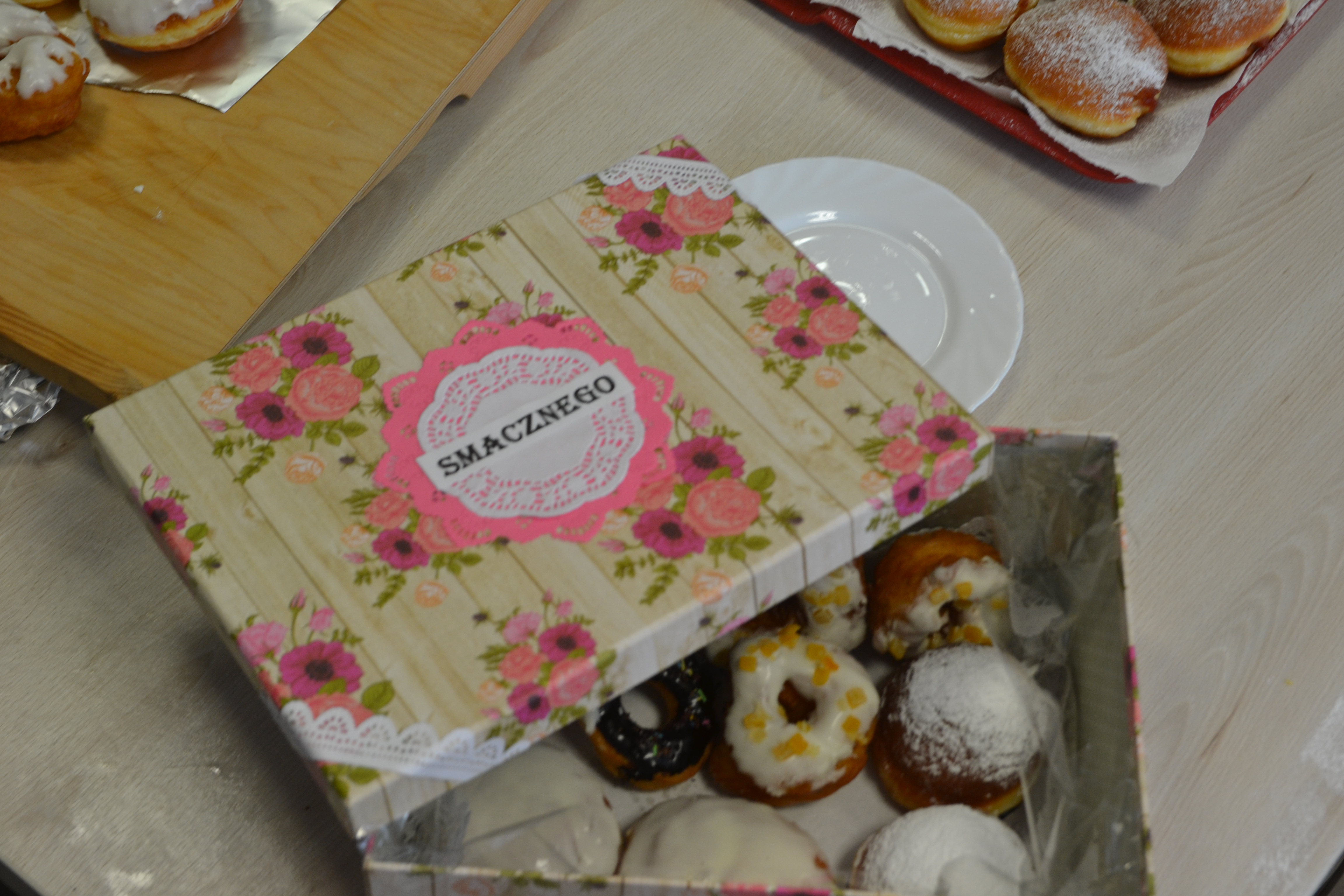 Na naszych stołach pojawiły się przepyszne pączki z nadzieniem różanym, donuty oraz gniazdka- wszystko pięknie i słodko ozdobione. Tego dnia nikt nie zwracał uwagi na kalorie, wszyscy objadaliśmy się do syta.